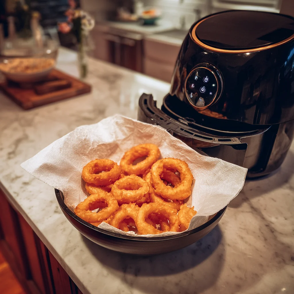 Soaking the onions in buttermilk not only enhances flavor but also helps the coating stick. Cornstarch in the flour mix adds extra crunch. For best results, slice the onions thinly and evenly. These are best eaten fresh but can be stored in an airtight container for up to one day. Re-crisp in the air fryer for a few minutes if needed.