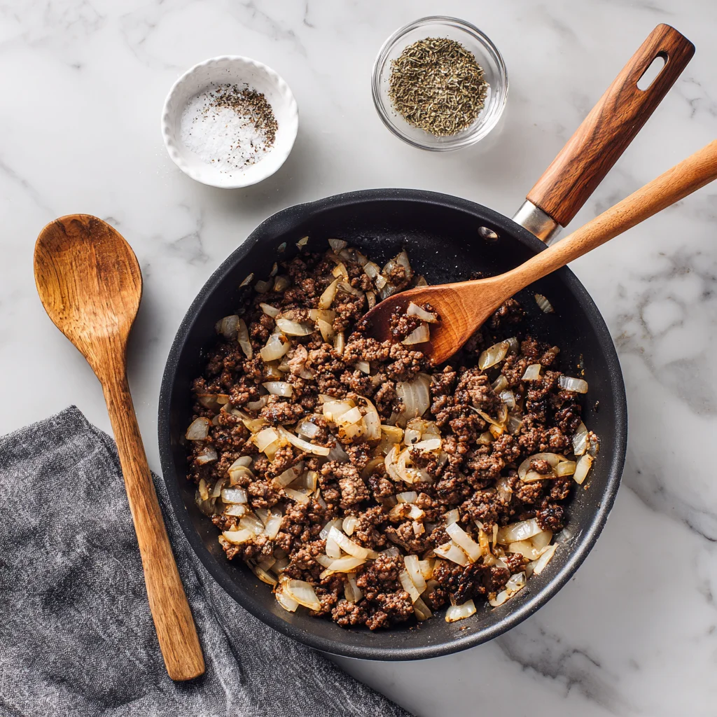 Add your ground beef to the skillet with the onions and garlic. Break it up with a wooden spoon and cook until browned and no longer pink. Season with a bit of salt, pepper, and Italian seasoning. Once everything’s cooked through, drain any excess fat so the casserole doesn’t end up greasy.