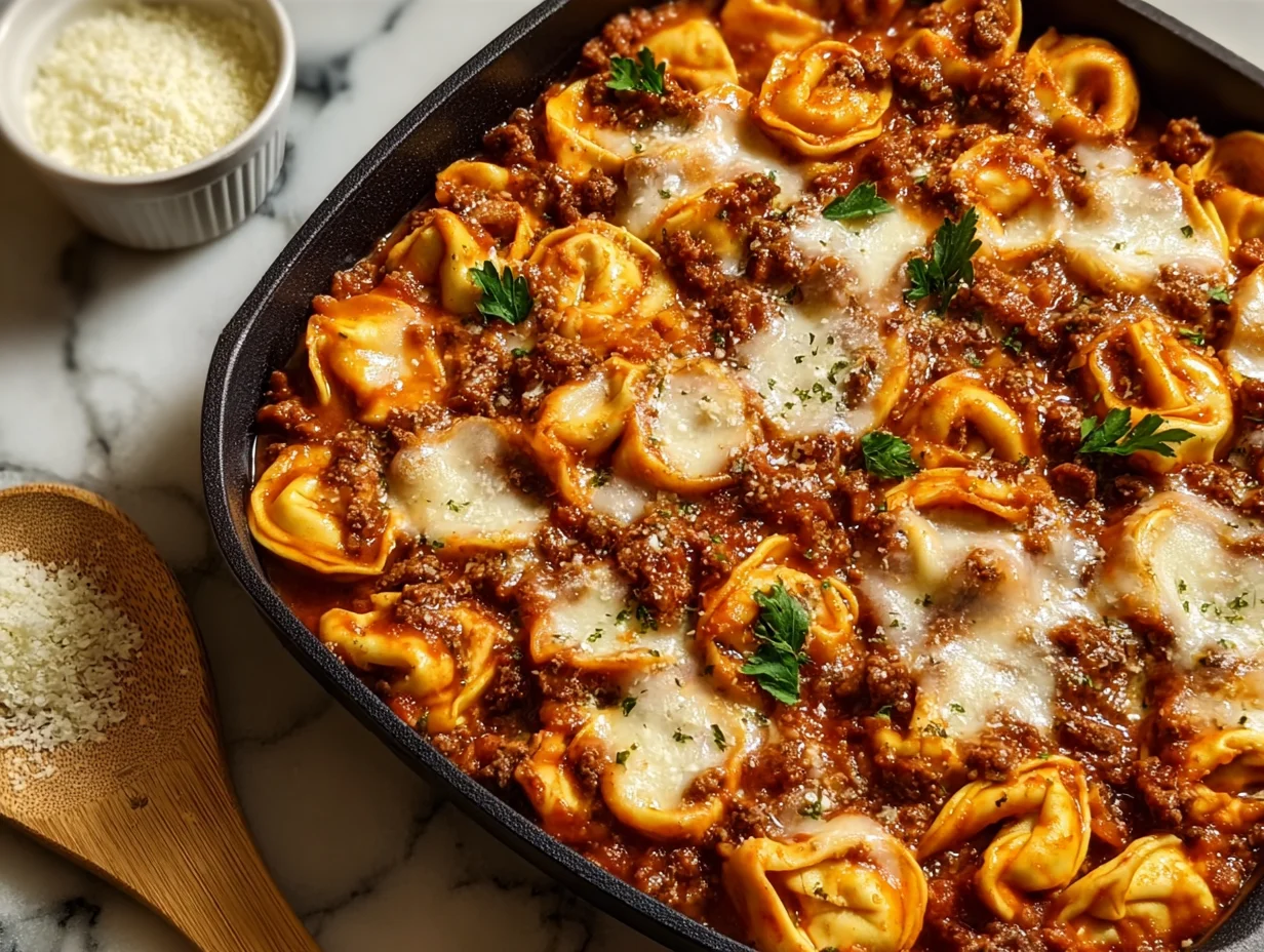 Cheesy Beef Tortellini Bake is a rich and comforting pasta casserole made with tender cheese-stuffed tortellini, savory ground beef, and a seasoned tomato sauce, all smothered in melted mozzarella and baked to bubbly perfection. This family-friendly dish delivers bold Italian-inspired flavors and a creamy, cheesy finish, making it an easy go-to for busy weeknights or cozy weekend dinners.
