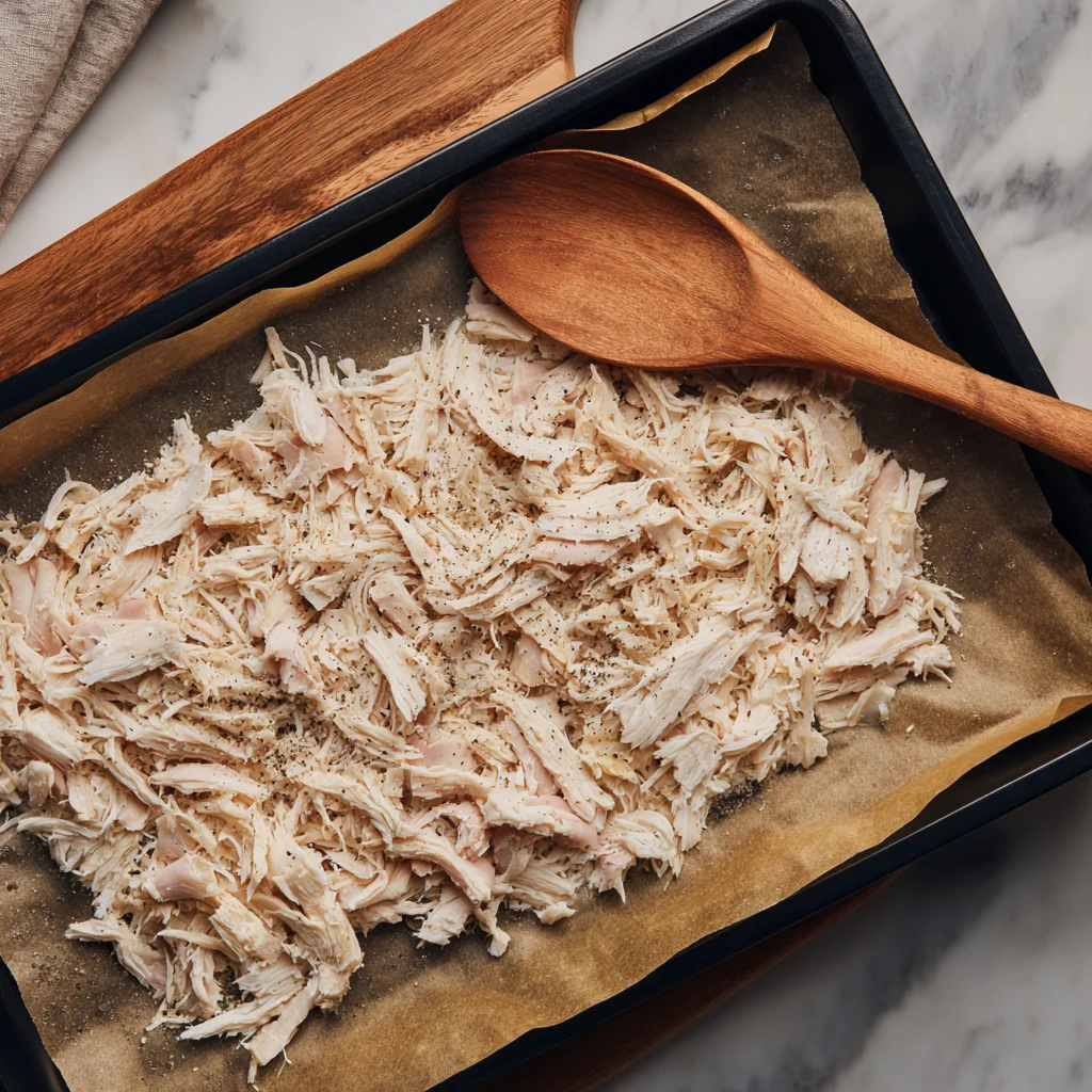 Next, lay down the Swiss cheese slices so they cover the mustard. Then add the ham slices right on top. Finally, sprinkle the shredded or chopped chicken over the ham, making sure it’s distributed evenly. Give it a light seasoning with salt and pepper to bring out all the flavors.