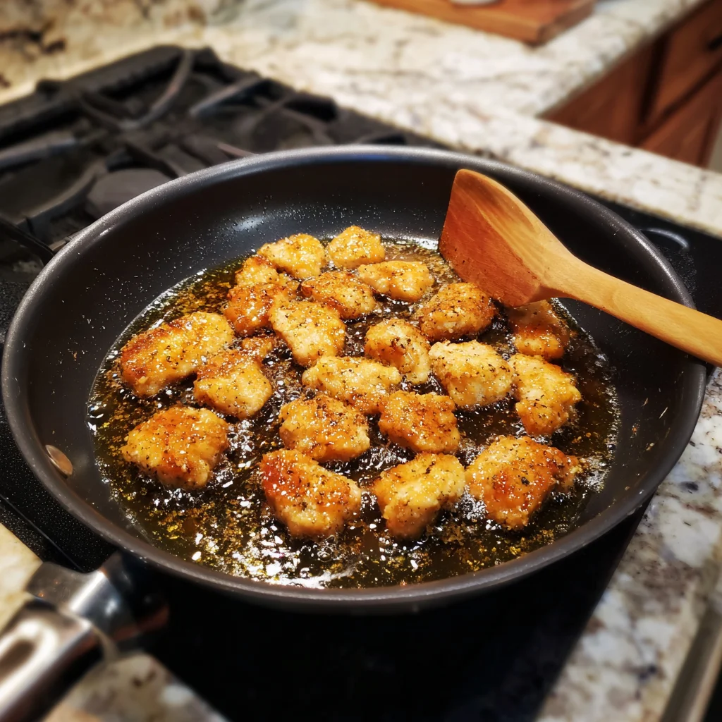 Next, heat 2 tablespoons of vegetable oil in a large skillet over medium-high heat. Once it’s nice and hot (test it with a small piece of chicken—it should sizzle immediately), add your chicken in a single layer. Don’t overcrowd the pan or the chicken will steam instead of crisp.
