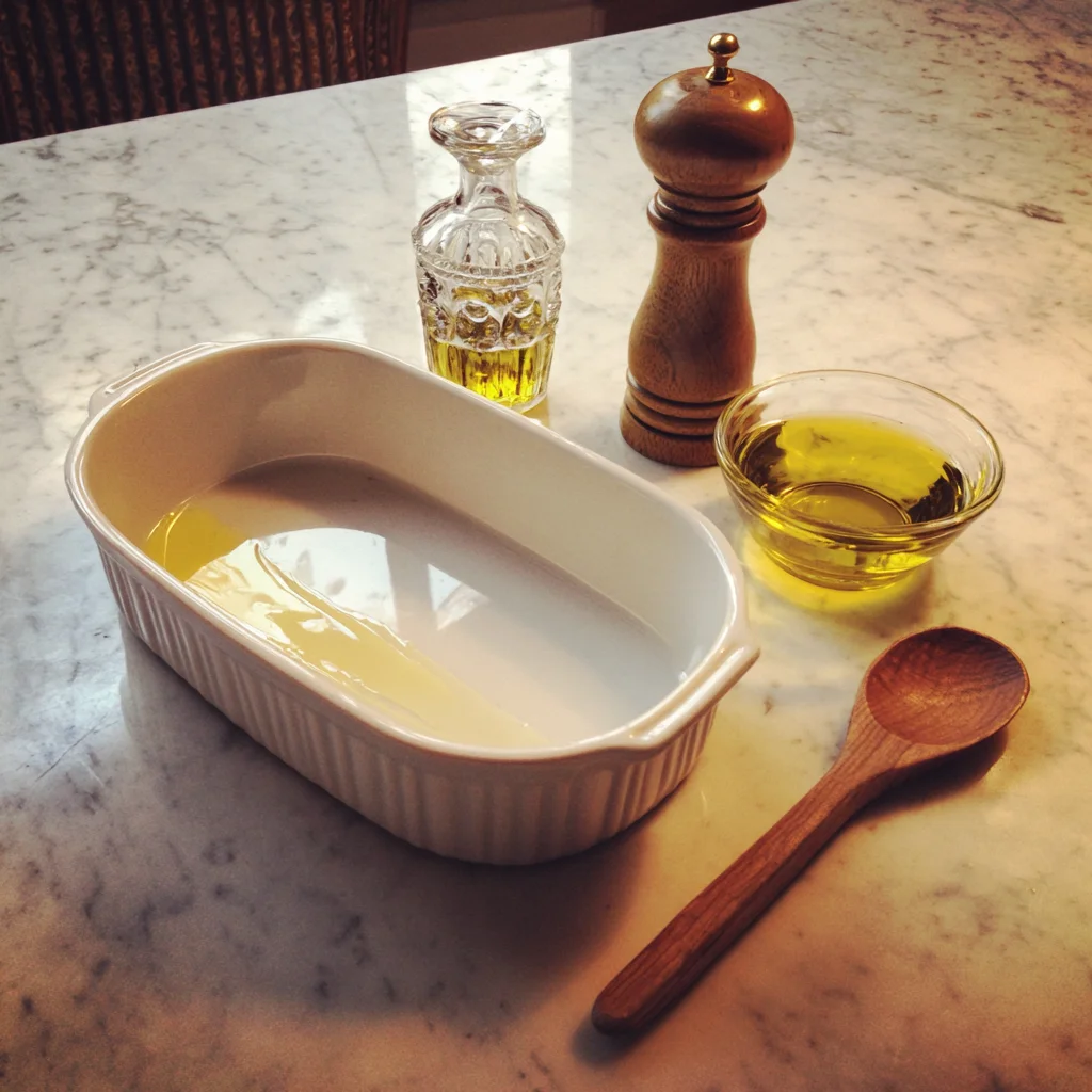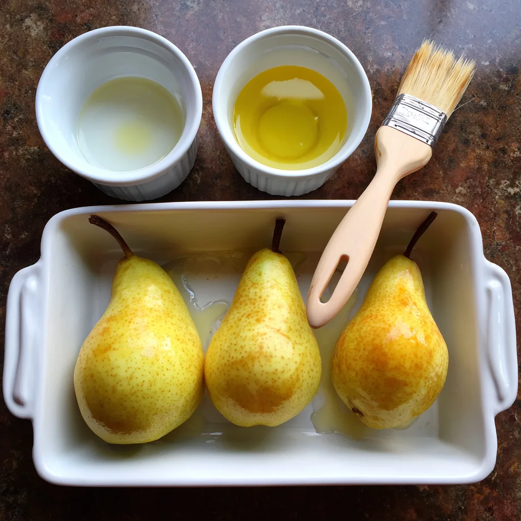 While your oven warms up, prep your baking dish by lightly brushing it with olive oil. This step helps keep the pears from sticking and adds a little extra richness.
