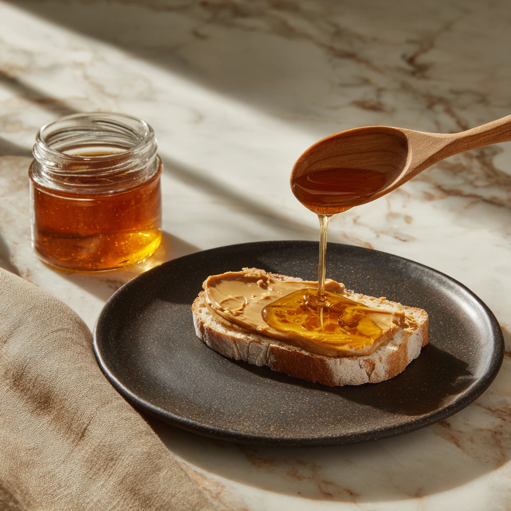 Spread 1 tablespoon of creamy peanut butter on each of two slices of bread. If you’re using honey or maple syrup, drizzle it over the peanut butter now. This little touch of sweetness balances the nuttiness and complements the banana beautifully. -