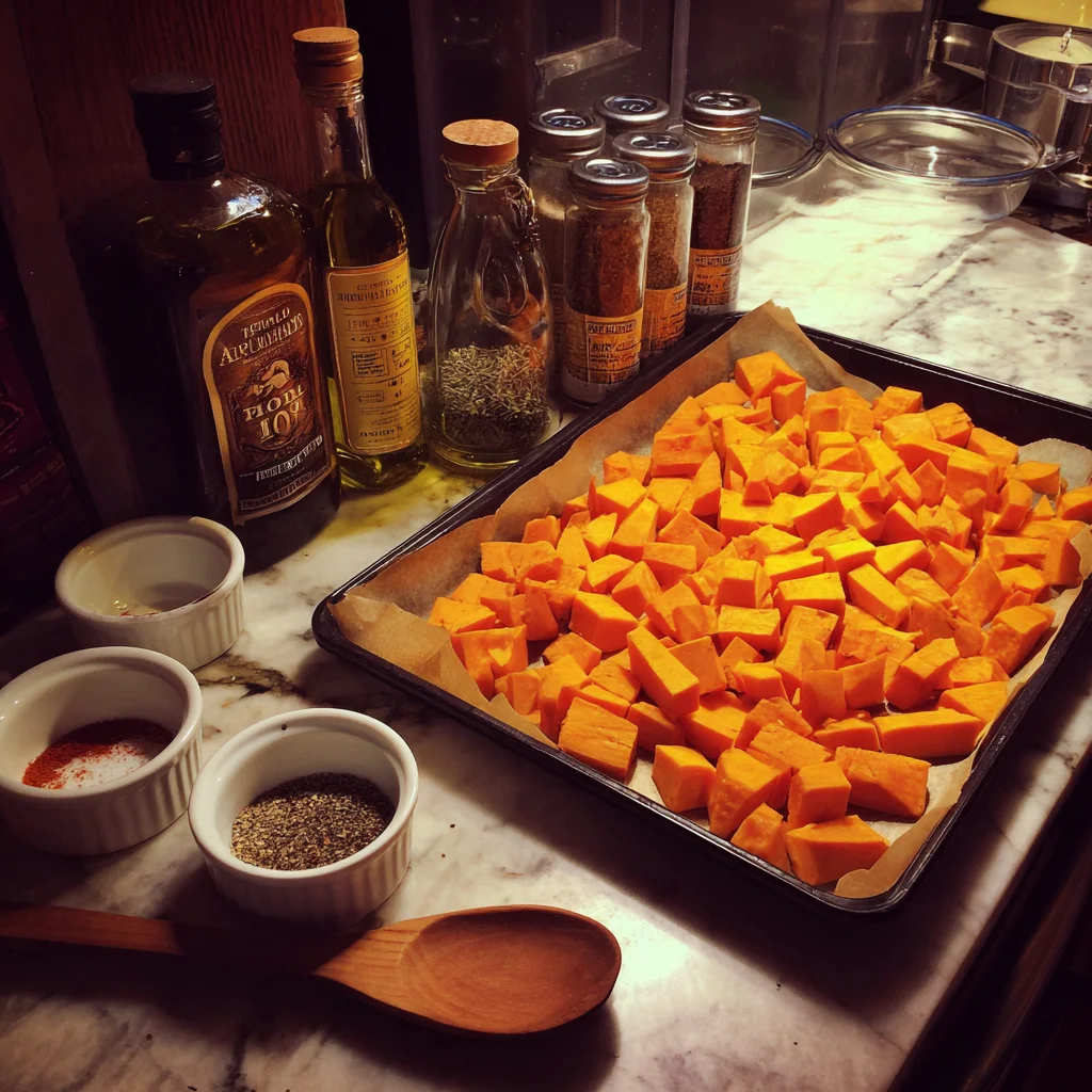 Toss the diced sweet potatoes in 1 tablespoon of olive oil, along with a generous pinch of salt and pepper, 1 teaspoon smoked paprika, and ½ teaspoon dried thyme. Make sure everything’s coated nicely. Spread the cubes out in a single layer so they roast evenly. Roast for 20 minutes, flipping halfway through to get those golden, crispy edges.