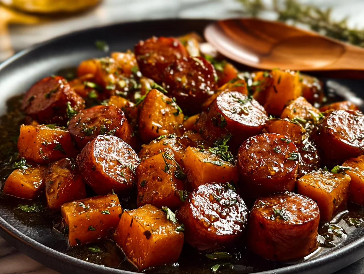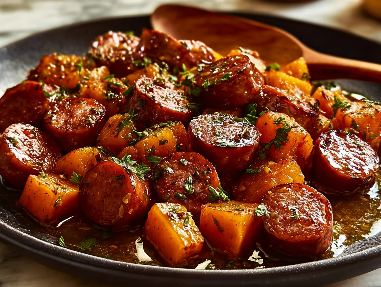 This is one of those dishes where everything sticks just enough — sweet potatoes absorb some of the glaze, sausage gets that glossy coating, and it all feels cozy and complete in the pan.